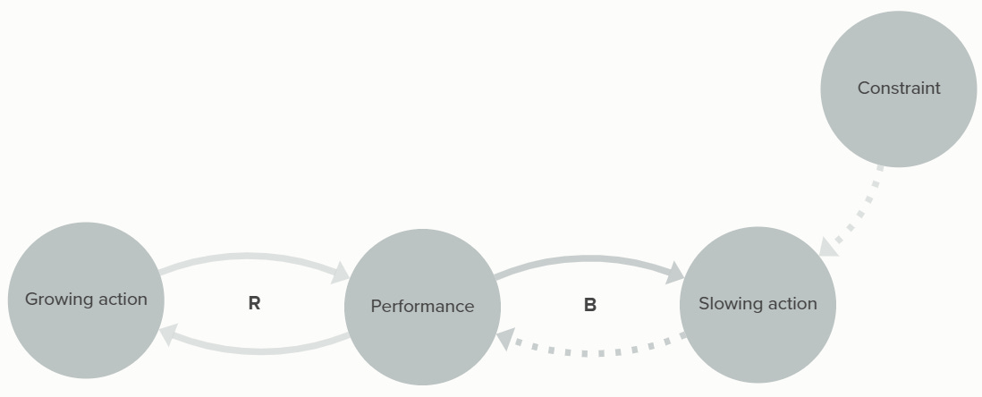The reinforcing loop on the left often follows a pattern of exponential growth; by measuring the doubling time of the process, you can get a sense of when the limits may become relevant. If you want to keep the growth going, finding ways to relax the constraint (finding new resources/markets/etc), minimize the impact of the balancing loop, or invest in long-term capacity might be viable strategies.
