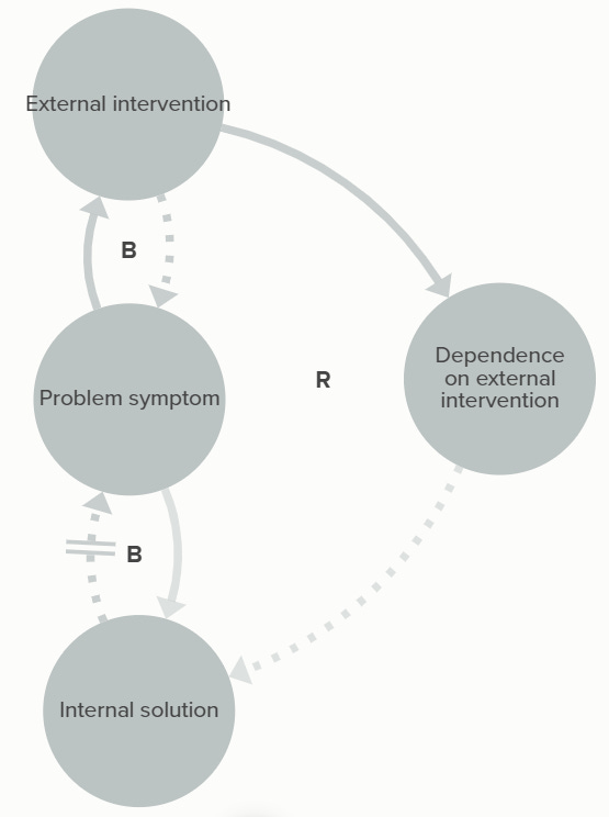 This archetype is also often linked to addiction, and it’s easy to see why: for a given problem and its associated symptoms, there’s a more fundamental solution to the problem that takes time, and there’s also the possibility of taking a different action that will alleviate the symptoms faster, but with the side effect of deterring or undermining the effectiveness of the real solution.