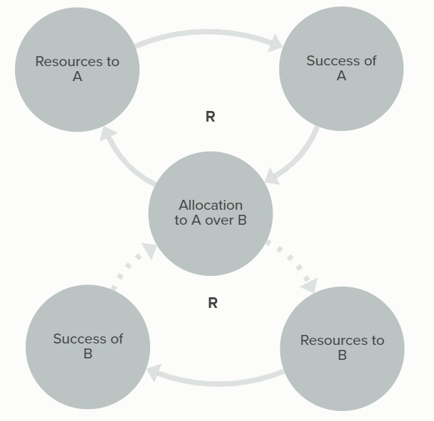 This archetype is also popularly called the Matthew effect1, based on its resemblance to sayings of Jesus along the lines of “to those who have, more will be given; from those that lack, will be taken away what little they have”. The key is that there’s some allocation mechanism that determines the distribution of a finite pool of resources, making it a zero-sum game, where the resources directly contribute to future success. This means that small differences in initial success tend to be amplified/reinforced over time for reasons that have nothing to do with potential, merit, etc, making a kind of self-fulfilling prophecy that justifies the original allocation decisions.