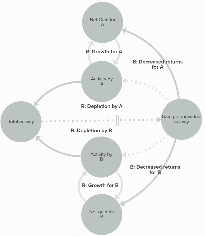 This is the most visually-complicated archetype, but fortunately it’s well-established as a concept in economics and environmental science2: some limited common resource becomes over-used because of the totally rational response of each individual actor3. For the individual user, increased use of the resource (grazing land, fishery, social trust) allows growth, but the increased use also depletes the resource for everyone, which speeds up the depletion while reducing returns for everyone. Sometimes these systems can compound: ahi tuna is threatened by overfishing, but also, the awareness that ahi may not be plentiful in the future makes me want to go eat poke as much as possible while I still can4, contributing to demand and accelerating the overfishing.